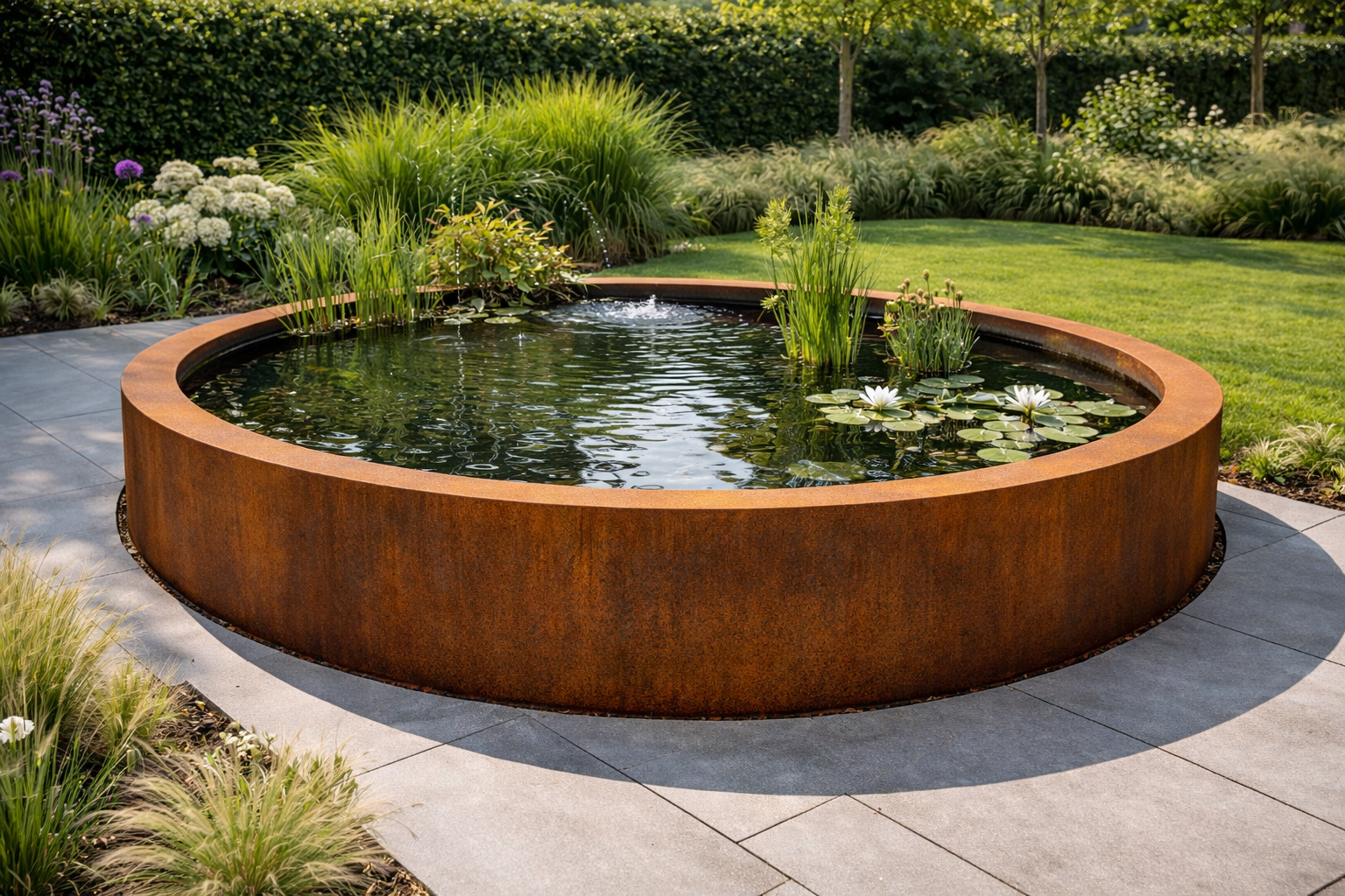 Ronde vijvers van cortenstaal zijn een stijlvolle en tijdloze eyecatcher voor iedere tuin. De warme, roestbruine uitstraling van het cortenstaal geeft een natuurlijk en luxe karakter dat perfect past in zowel moderne als landelijke buitenruimtes.